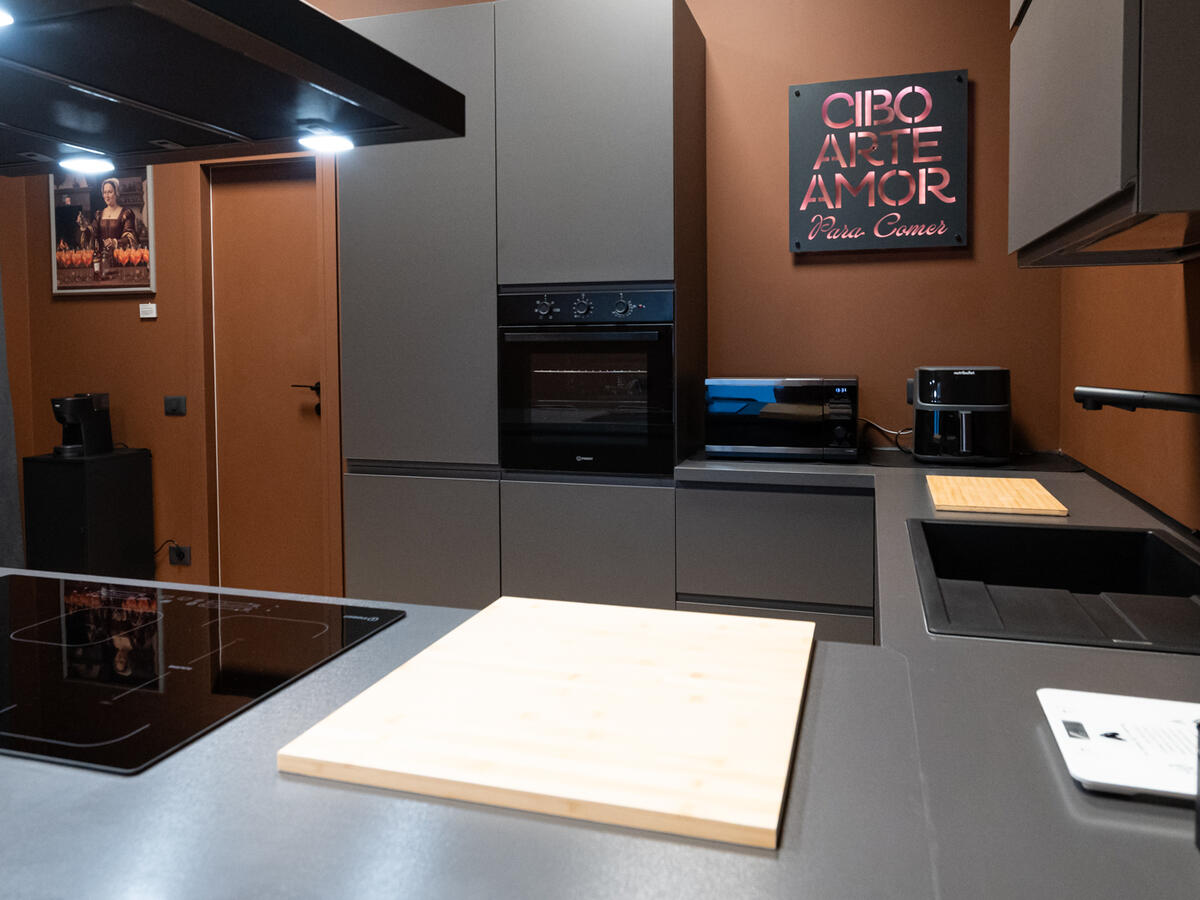 Area "Para Comer" (20mq): Una cucina domestica, completamente attrezzata (forno, induzione, friggiritrice ad aria, micro, pentole,padelle, mise en place). È il cuore pulsante per showcooking, cene private con chef a domicilio, team building culinari o come set per shooting food e video-ricette.