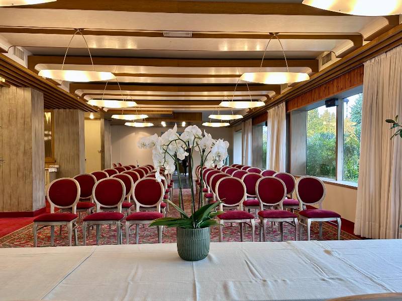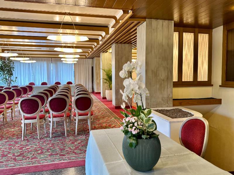 La grande sala ristorante può ospitare fino a 200 persone e si presta a cene aziendali, eventi incentive e momenti conviviali. La cucina valorizza i sapori del territorio trentino con un approccio moderno, salutare e raffinato orientato alla longevità.